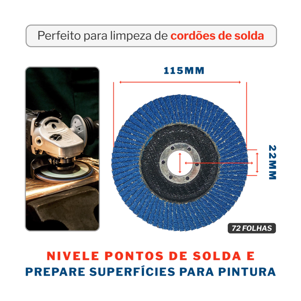 O Disco Flap é um produto utilizado em lixadeiras e esmerilhadeiras angulares para processos de desbaste, acabamento e remoção de material, principalmente em superfícies de aço carbono e inoxidável.
