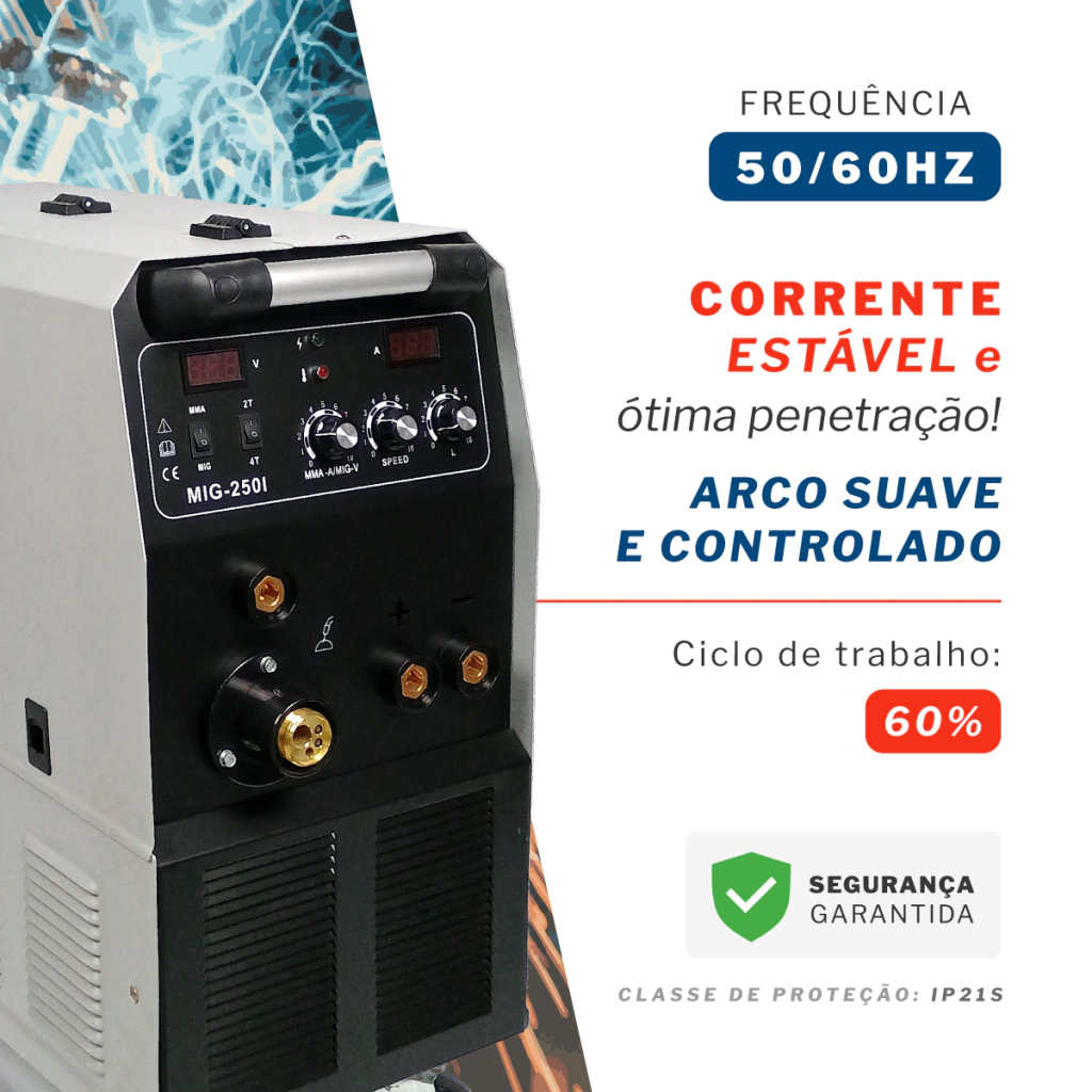 Máquina de Solda Inversora 250A MIG/MAG e MMA Alta Potência 220V 50/60Hz + Tocha e Acessórios