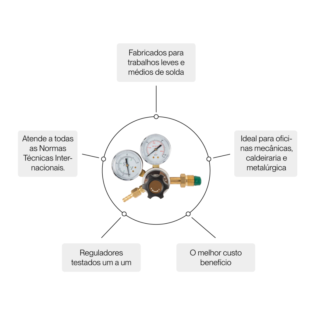 O Regulador de Pressão Argônio/Mistura P/Solda MIG e TIG é projetado para uso em cilindros em trabalhos leves e médios de solda, aquecimento e corte de metais.